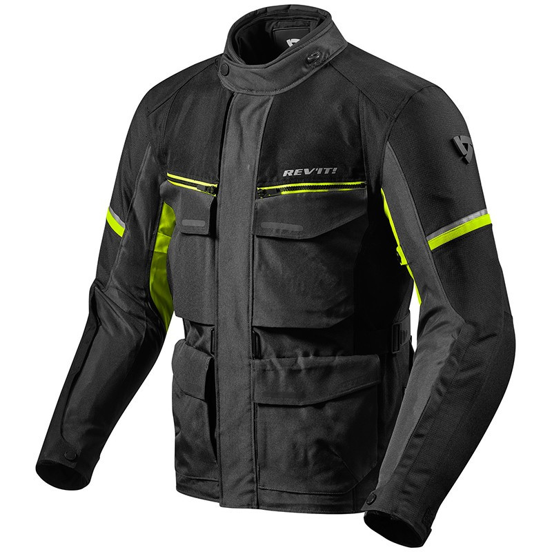 - El coll està equipat amb el sistema Rev'it flexisnap que permet un ajustament fàcil i ràpid de la circumferència del coll per a un aïllament perfecte contra el fred i la pluja, i en posició d'estiu és possible deixar-lo obert gràcies al clip del coll.