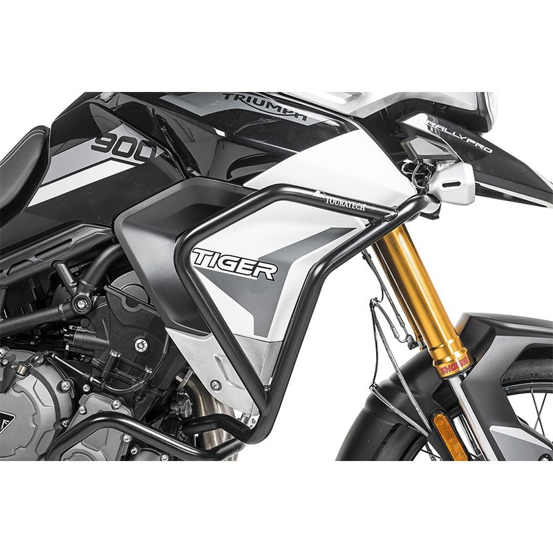 Aquestes robustes barres de protecció superiors de Touratech protegiran el carenat, el dipòsit de combustible, el radiador i altres parts crítiques del seu Tiger 900 de danys fins i tot en les caigudes més dures fora de la carretera.