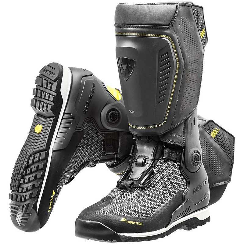 - Rev'It System (Dynamic Support Frame), ein System aus starren, thermogeformten und gegliederten Schalen, die eine gute Unterstützung der Wade, der Fersenschale und des seitlichen Stabilisierungsrahmens ermöglichen, um optimalen Schutz wie bei einem Cross-Schuh zu bieten und die Überdehnung zu begrenzen das Set im Falle eines Sturzes und bietet gleichzeitig perfekte Bewegungsfreiheit bei Motorradfahrten und beim Gehen.