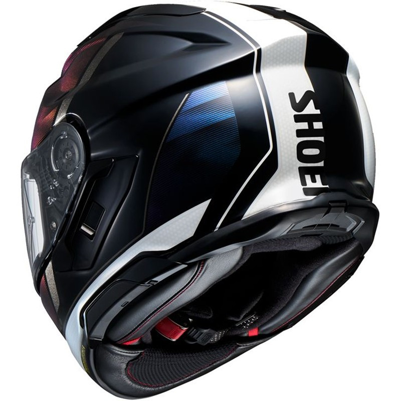 Dieser Shoei-Integralhelm ist mit einem farblosen Visier ausgestattet, das ein weites Sichtfeld bietet, wird mit dem Pinlock-Antibeschlagsystem verkauft und ist außerdem mit einer einziehbaren Sonnenblende ausgestattet, um Sie vor der Sonne zu schützen.