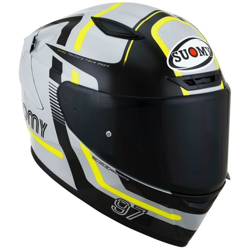 The Suomy Track-1 Ninety Seven helmet represents the very latest generation of full-face helmets made from the Suomy brand's tri-composite fibres (carbon, aramid, glass).