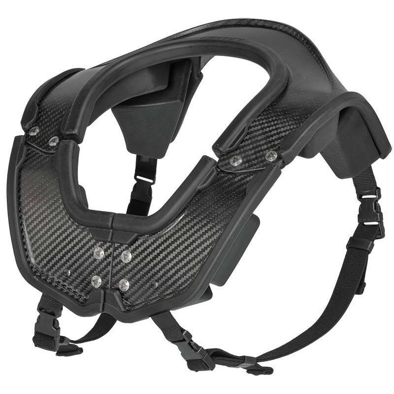 In the event of bending movements of the neck, this innovative support forms a base on which the lower edge of the helmet rests and prevents direct contact with the body. The extremely light weight support has been obtained through the use of carbon fiber and careful product design. Equipped with a vast range of soft inserts in various sizes ensures an optimum fit. The front opening system has been designed to make the product easier to put on, even while wearing a helmet.