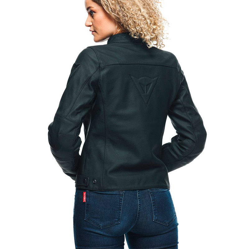 La chaqueta está equipada con discretos y cómodos protectores en los codos y los hombros y está fabricada con cuero prémium, poniendo de manifiesto la calidad y el estilo Dainese.