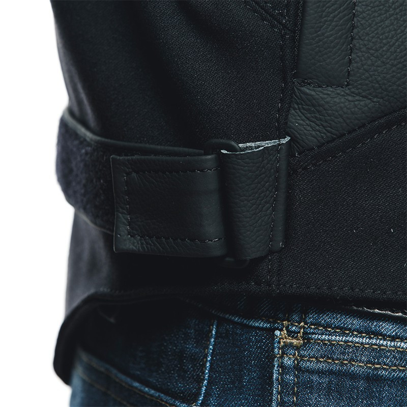 - Las mangas se cierran con un sistema de cremallera y lengüeta de cuero con sistema de velcro.