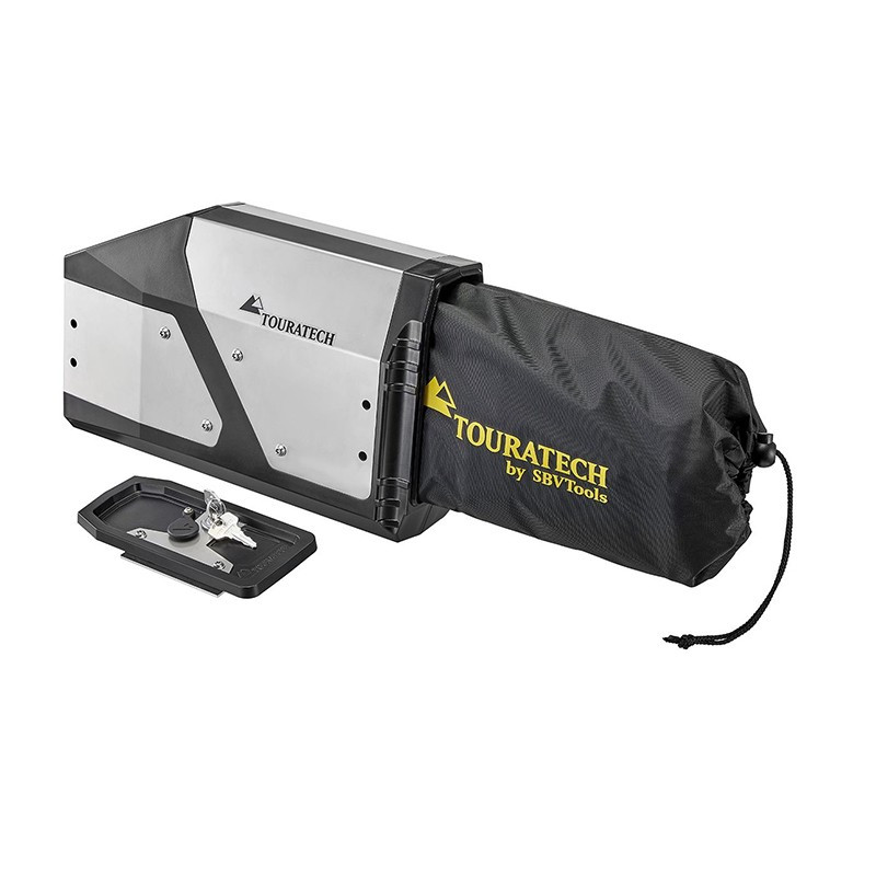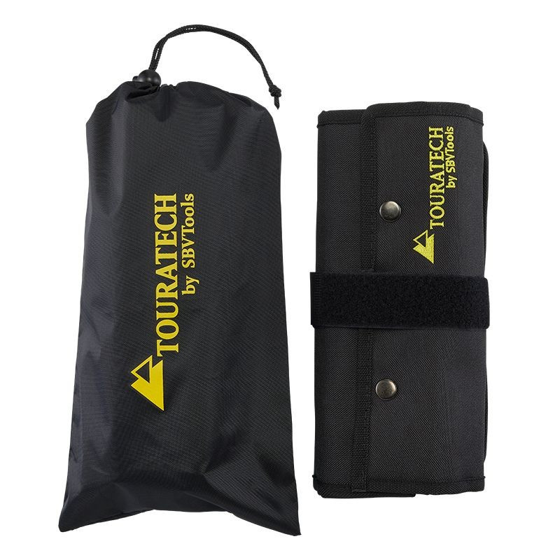 La base y la llave están recubiertas de cromo satinado Cr-V. Con sus dimensiones compactas, esta bolsa de herramientas para motocicletas con el diseño de Touratech siempre encontrará un lugar en su motocicleta.