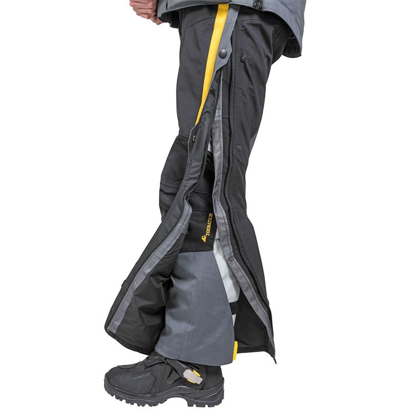 La protección adicional de membrana tanto en el exterior como en el interior del bajo del pantalón protegen los materiales de gran calidad contra las feas rozaduras generadas por el bastidor de la moto y las hebillas de las botas.