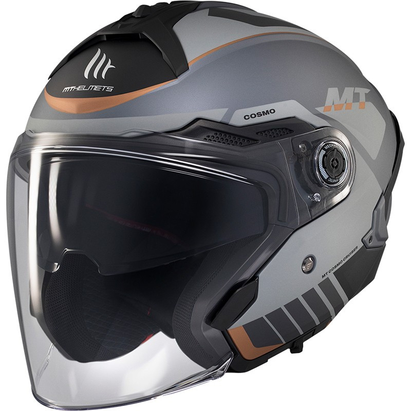 La marca española MT Helmets, te ofrece su casco de moto jet de policarbonato homologado CE 22.06 con pantalla solar interna, el Cosmo SV Cruiser.