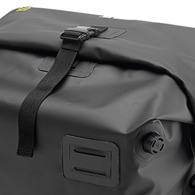- Il peut être utilisé également sur le couvercle du top-case ou comme un sac de selle, en le fixant avec les sangles élastiques jaunes fluos fournies.