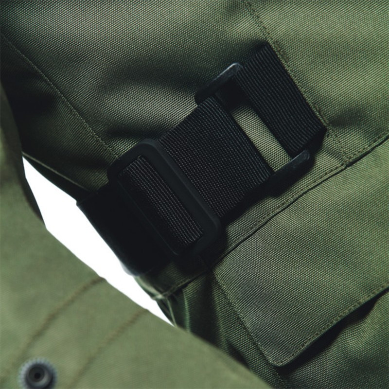 - La veste est principalement construite en textile haute résistance Polyester Oxford 600D avec des inserts 3D en caoutchouc sur les zones les plus exposées comme les épaules et les coudes pour une résistance supplémentaire.
