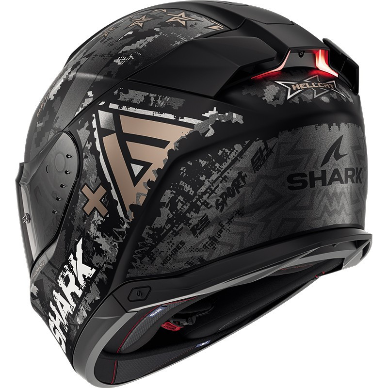 Le Shark Skwal i3 Hellcat Mat est le premier casque de moto intégral intelligent doté de feux de position LEDs et de feux de stop actifs de série et il dispose de l'homologation ECE 22-06.
