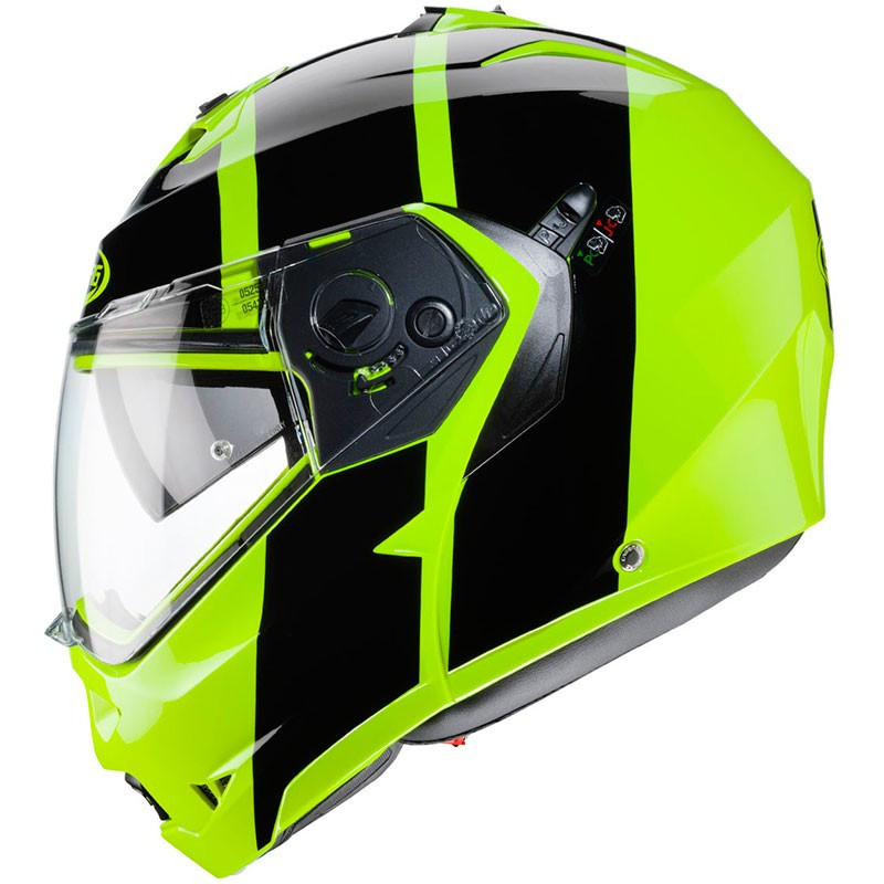 DUKE II è dotato della doppia omologazione P/J che permette di guidare anche con la mentoniera alzata garantendo sicurezza grazie al comando P/J posto sul lato sinistro del casco.