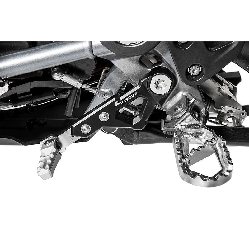 La leva del cambio Touratech può essere regolata con precisione in base al piede e, grazie alla sua forma pieghevole, non si rompe ogni volta che ci si ribalta.
