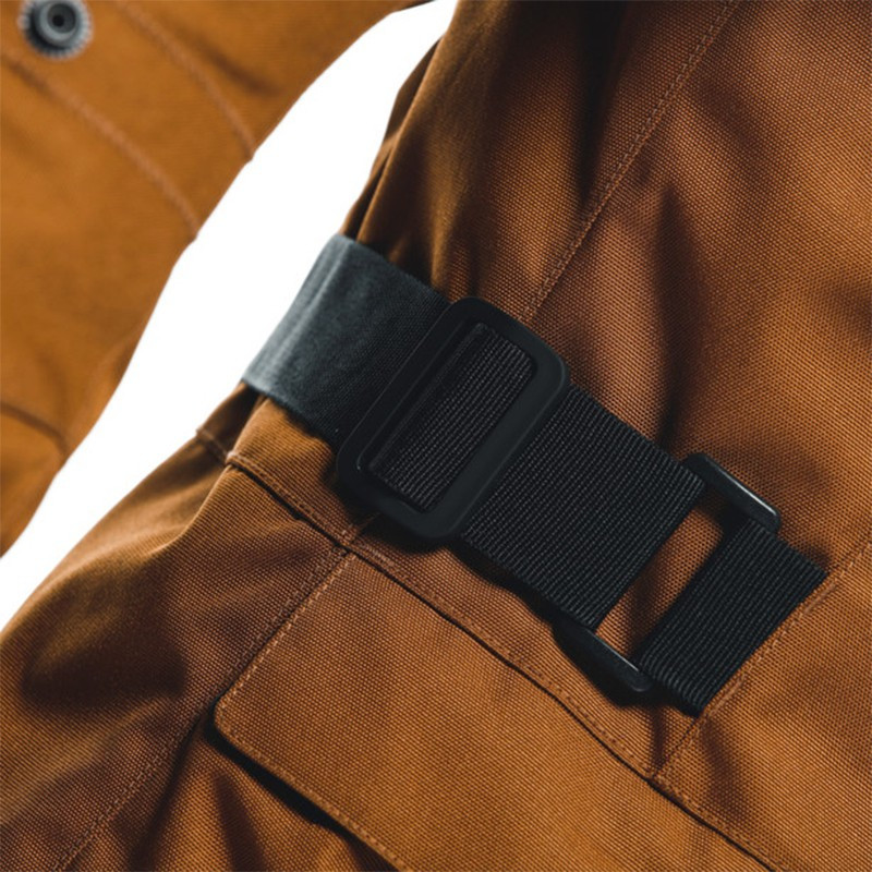 • O casaco é fabricado principalmente com tecido Oxford de poliéster 600D de alta resistência, com inserções de borracha 3D nas zonas mais expostas, como os ombros e os cotovelos, para maior resistência.