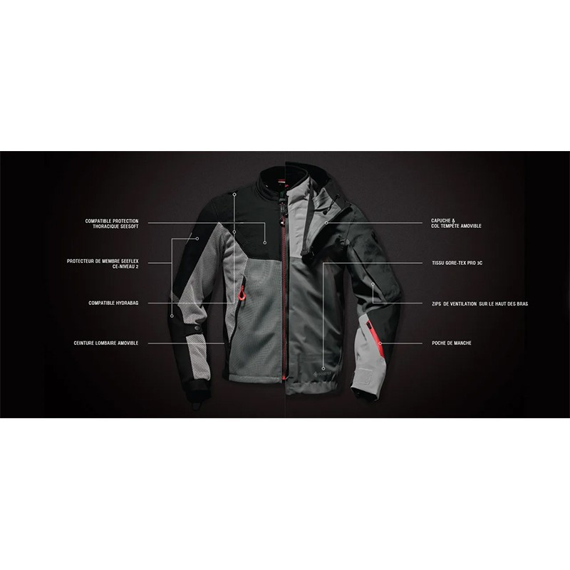 É composto por duas camadas exteriores: uma camada de malha ventilada com protecções para a verão e uma camada exterior impermeável Gore-Tex que permite a utilização do casaco durante a meia estação.