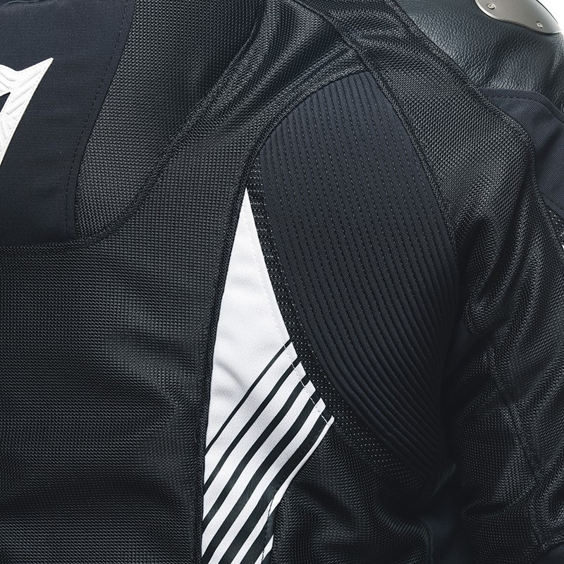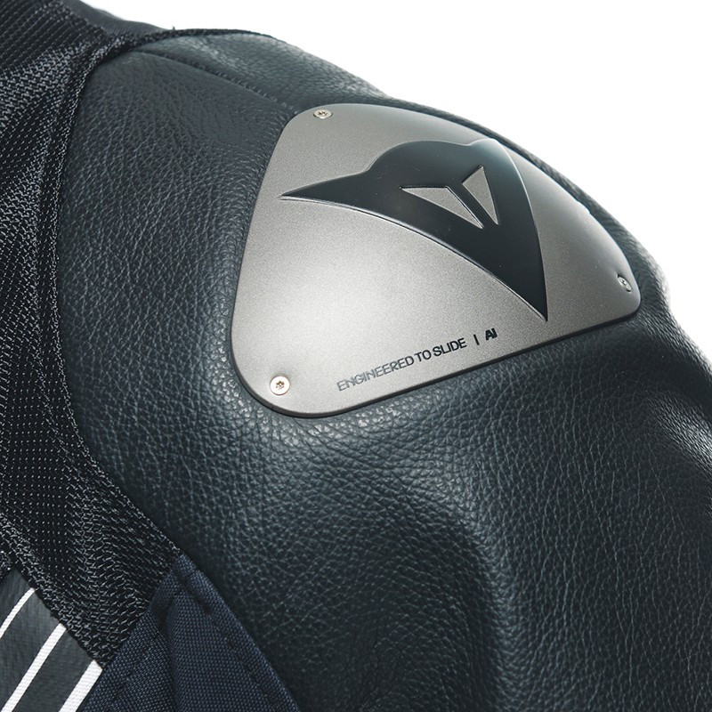 - Blusão composto por vários materiais, incluindo couro de vaca nas áreas mais expostas, como cotovelos e ombros, e tecido Mugello flexível e resistente para uma proteção completa.