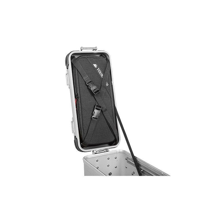 Reforçado com espuma de 7 mm nos lados inferior e superior, o saco é fixado diretamente na tampa da mala ZEGA Evo através de duas correias.