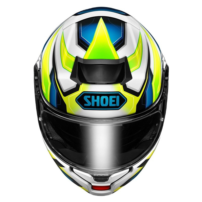 Este capacete modular Shoei está equipado com um ecrã incolor com um amplo campo de visão, com uma película anti-embaciamento Pinlock e uma proteção solar retrátil.